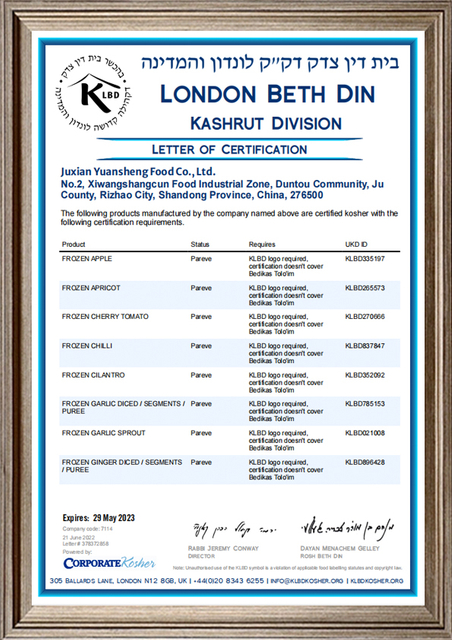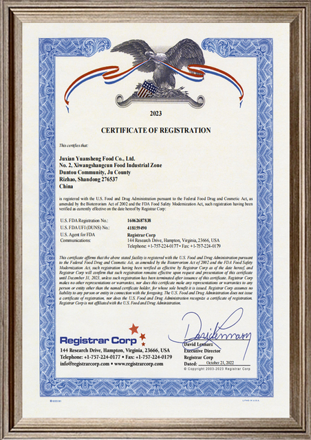 Компания выстраивает полную систему управления качеством для строгого контроля продукции от поля до сбора урожая, от производства до эксплуатации.Он получил сертификат HACCP, BRC, FDA, KOSHER и глобальный GAP.Компания имеет собственное лабораторно-испытательное оборудование и средства для проверки органов чувств, физико-химических, микробных и пестицидных остатков.